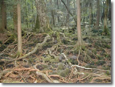 ●青木ケ原樹海の方は、先が見えないくらい緑があるのと、木々がおたがい支え合って生きているんだなあというように、根っこを横に張りながら色々なアーティスティックなヨガをやっているような形をしながら立っているのが、こっちは根っこがほとんど土の上に出ていないような、しかも枯れ草にある程度覆われている・・・。